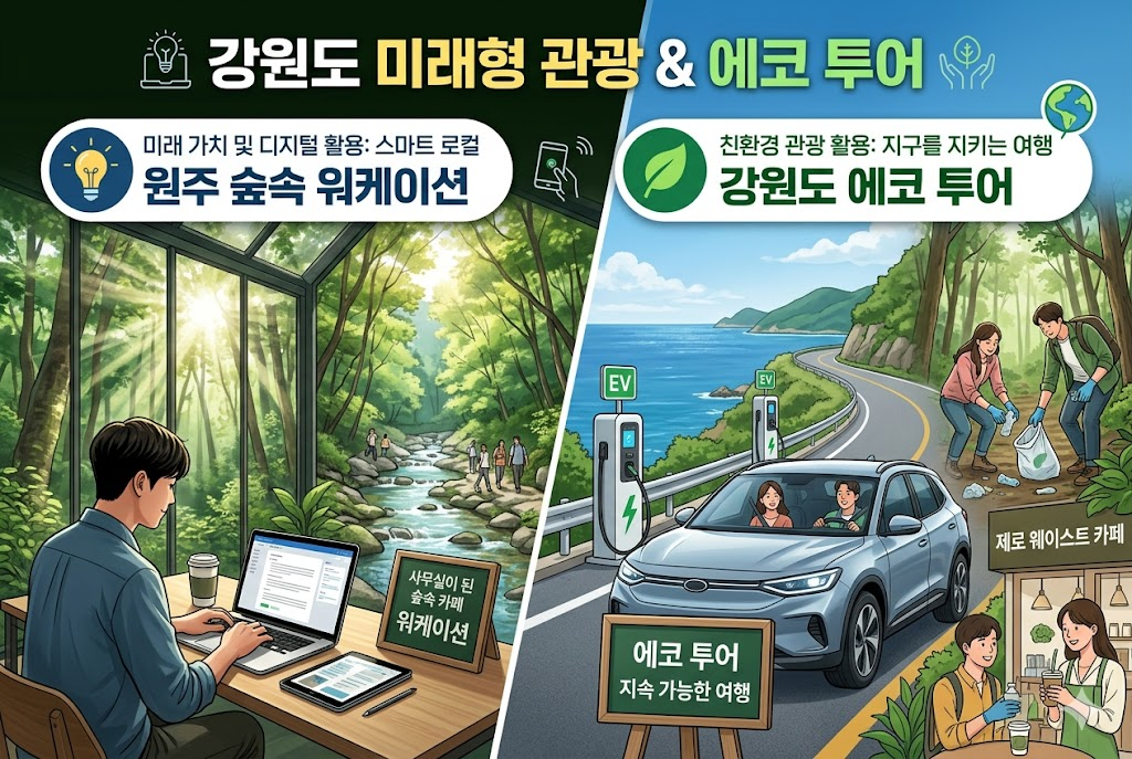 지속 가능한 내일을 위해 강원도의 친환경 관광 콘텐츠를 적극 선택해 보세요. 전기차 렌터카를 이용해 해안 도로를 달리고, 플라스틱 없는 제로 웨이스트 카페를 찾아다니는 '에코 투어'는 이제 하나의 트렌드입니다. 탄소 중립 인증을 받은 숙소를 이용하거나 트레킹 중 쓰레기를 줍는 활동에 참여하며 강원도의 청정 자연을 후대에 물려주는 일에 동참하세요. 당신의 사소한 선택이 강원도의 미래 가치를 지키는 강력한 힘이 됩니다. 🌱