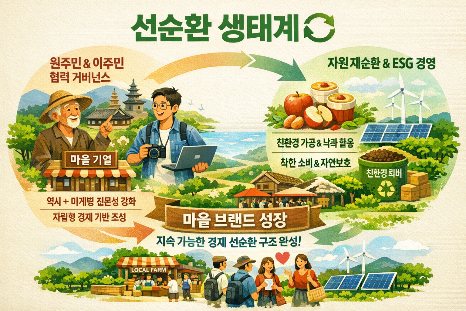 단순한 수확을 넘어 ‘생산-가공-관광’이 하나로 묶일 때 지역경제는 살아납니다. 원주시 법정리 단위의 고유 자원이 브랜드가 되고, 원주민과 이주민이 협력하여 새로운 부가가치를 만드는 산업 선순환 구조를 정리했습니다.